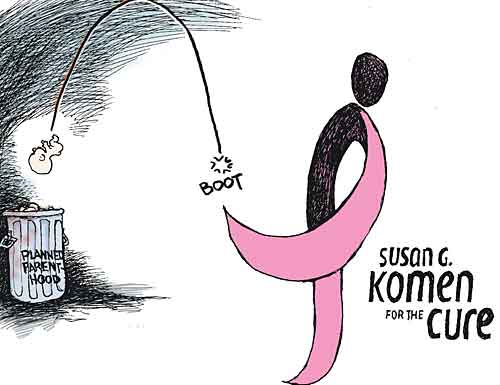 02/01/12 Komen responds to the growing liberal media backlash by issuing a statement: “we made the decision to implement stronger performance criteria for our grantees to minimize duplication and free up dollars for direct services to help vulnerable women. To support this new granting strategy, Komen has also implemented more stringent eligibility standards to safeguard donor dollars. Consequently, some organizations are no longer eligible to receive Komen grants.”[4]